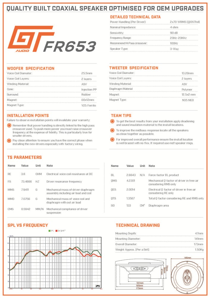 GT Audio GT-FR653 6,5″ 16,5cm 3-Way Coaxial Speakers 2x70W RMS Pair