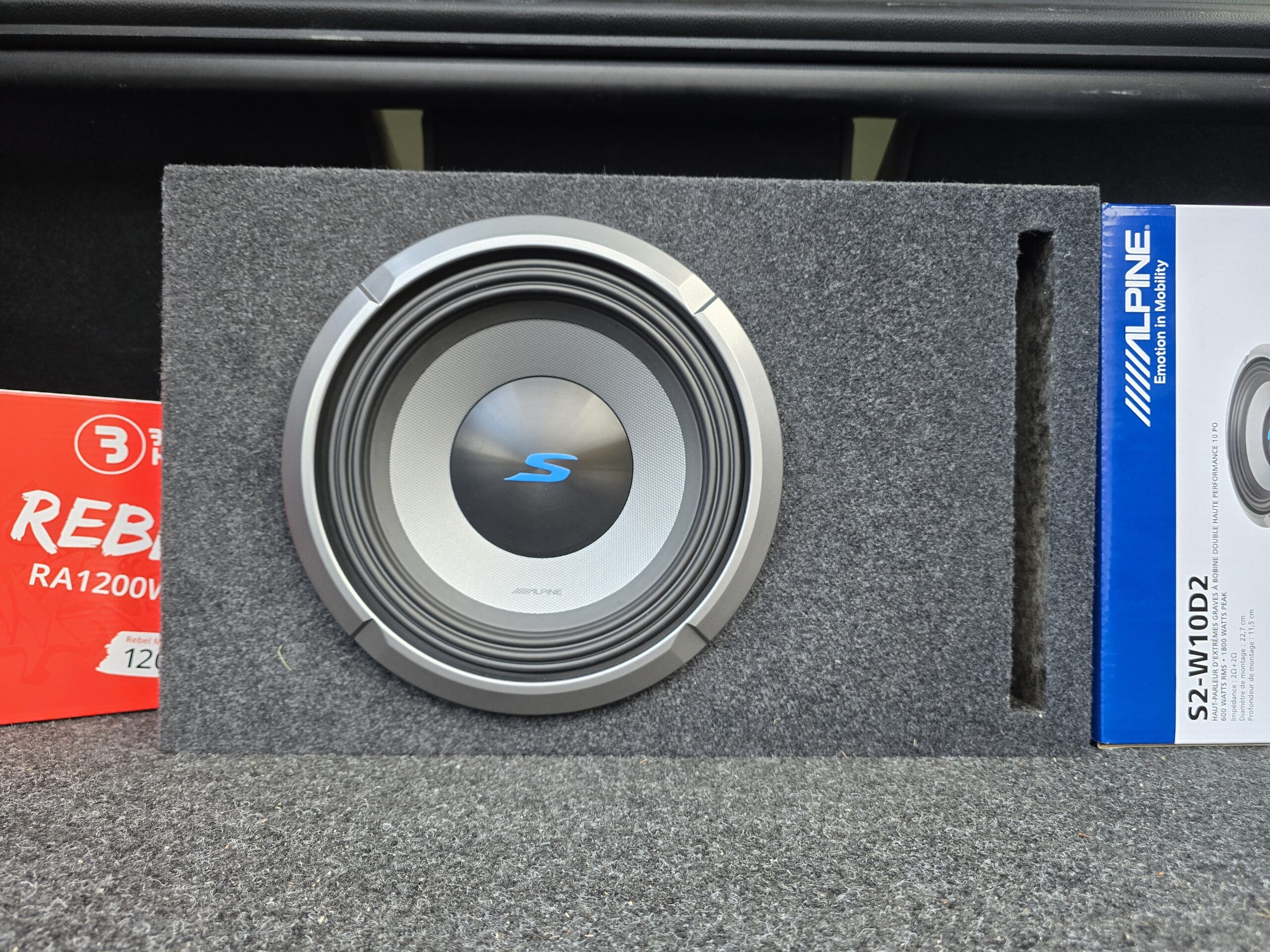 Element: Alpine S2-10D2, 1800W Max, 600W RMS. 2+2ohm. Ühendatud 1 ohm peale. 25-215Hz.